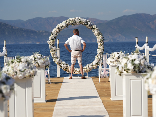 Maris Beach in Kumlübuk allows you to tie the knot out at the pier within the clear blue waters surrounded by a breathtaking backdrop of pine-clad mountains.